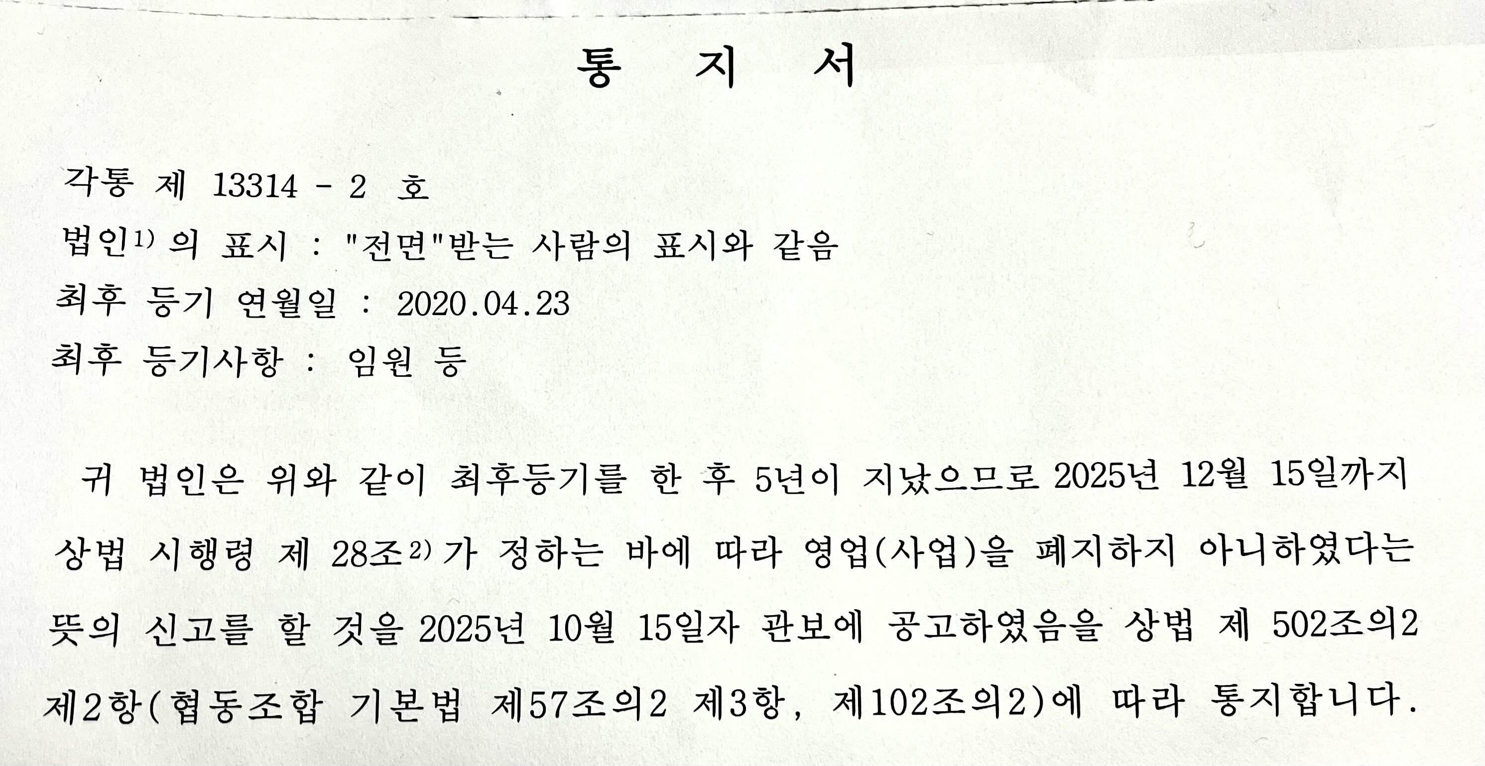 2025년 12월 15일까지 "우리 회사는 아직 영업 중입니다"라는 신고를 하거나, 밀린 등기(임원 변경 등)를 마쳐야 합니다.